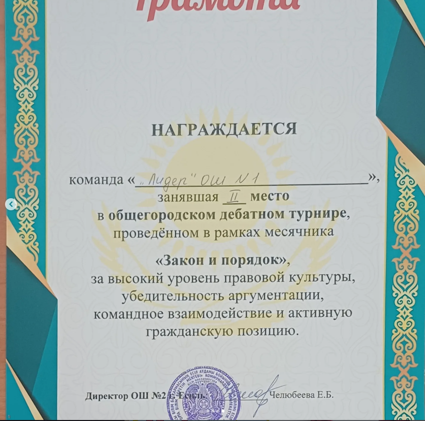 2 ақпанда "Есіл қаласының №2 ЖББМ" КММ базасында "Заң және тәртіп" айлығы аясында жалпықалалық пікірсайыс турнирі өтті.