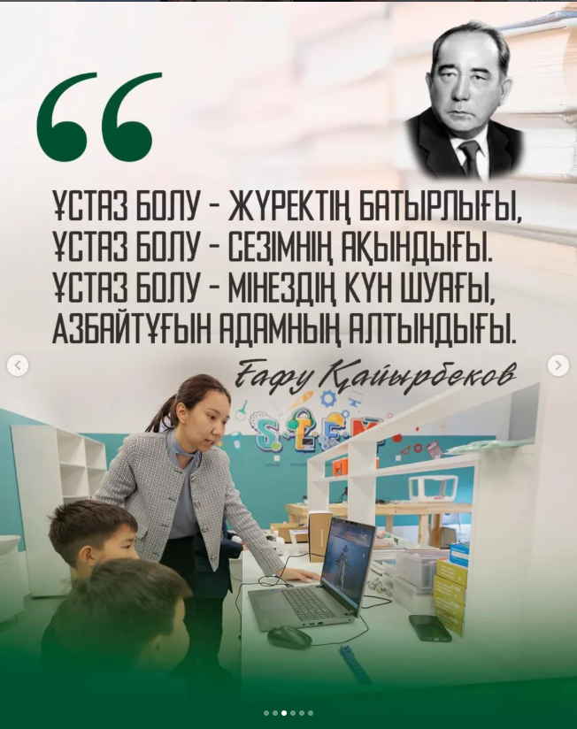 Мемлекет басшысы Қасым-Жомарт Тоқаев: «Мұғалімнің мәртебесі қашанда бәрінен биік. Ұлы тұлғалардың өзі ұстазының алдында шәкірт болып қала береді. Ұлттың болашағы – ұстаздың қолында. Менің мақсатым – ұстазды қоғамымыздың басты кейіпкері ретінде дәріптеу», - деп атап өтті.