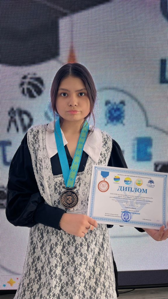 8А сынып оқушысы Дарья Сатинаны (мұғалімі: В. Ю. Васильева) ерекше жетістігімен – орыс тілі мен әдебиеті пәнінен 7-8 сынып оқушыларына арналған республикалық олимпиаданың аймақтық кезеңінде үшінші орын алуымен құттықтаймыз!